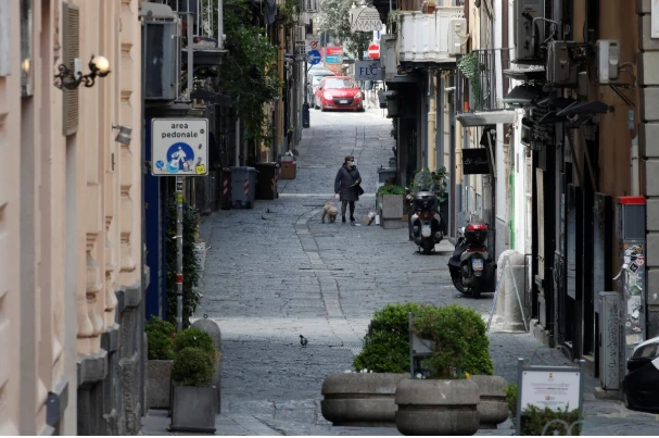 Một phụ nữ dắt chó đi dạo ở vùng Naples (Ý) ngày 5-4. Ảnh: REUTERS