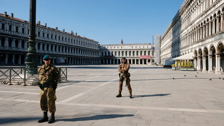 Binh sĩ tuần tra Quảng trường Saint Mark vắng vẻ ở Venice (Ý). Ảnh: REUTERS