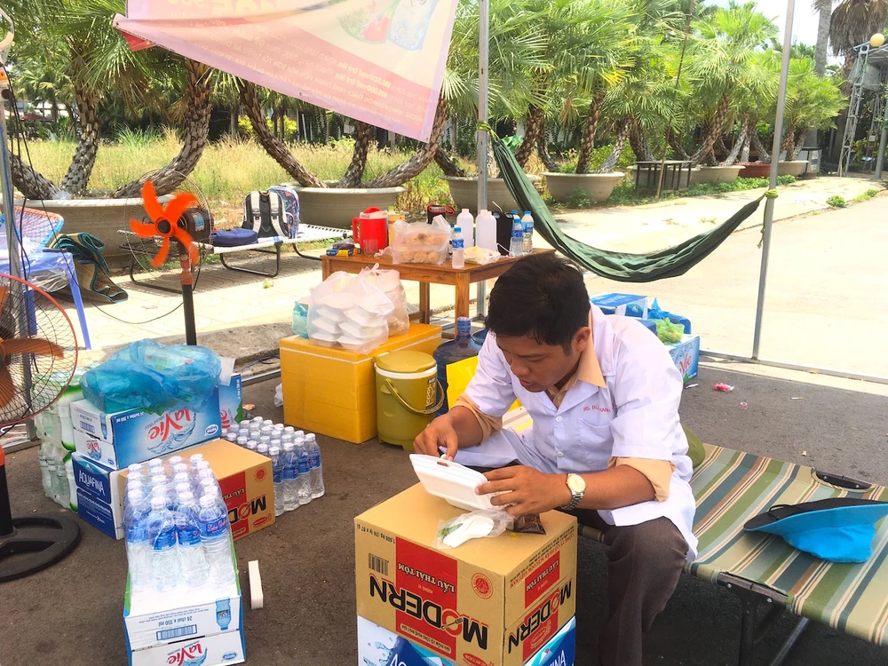 "Mỗi lực lượng có thời gian trực khác nhau, riêng lực lượng y tế của trung tâm chia thành hai ca trực, 12 tiếng/ca. Mặc dù nắng, gió, thức đêm hôm nhưng các anh em luôn làm việc tích cực, không hề than vãn, nêu cao tinh thần chống dịch như chống giặc" - ông Vinh cho biết.