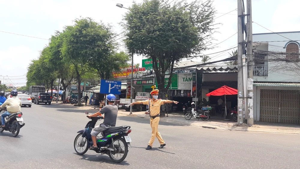 11 giờ trưa 31-3, tại điểm giám sát y tế trên đường Quang Trung (phường Hưng Phú, quận Cái Răng) dẫn vào nội ô quận Ninh Kiều, mặc cái nắng đổ lửa, các chiến sĩ cảnh sát giao thông mồ hôi nhễ nhại vẫn đang tích cực điều tiết giao thông hướng dẫn các phương tiện dừng để kiểm tra thân nhiệt hành khách.
