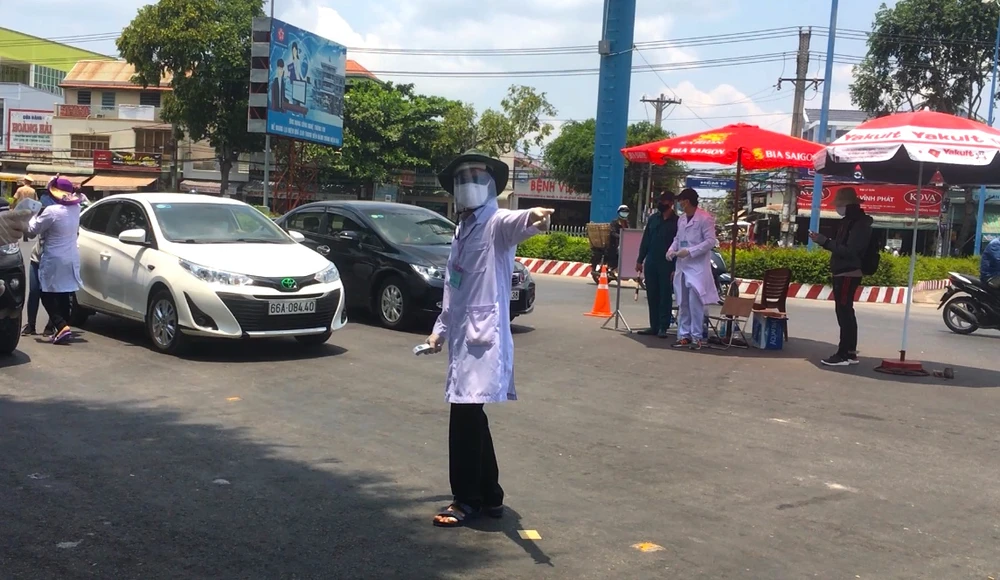 Điểm kiểm tra y tế khu vực cầu Đầu Sấu còn có lực lượng quân đội tham gia công tác kiểm tra thân nhiệt. Ảnh: HẢI DƯƠNG