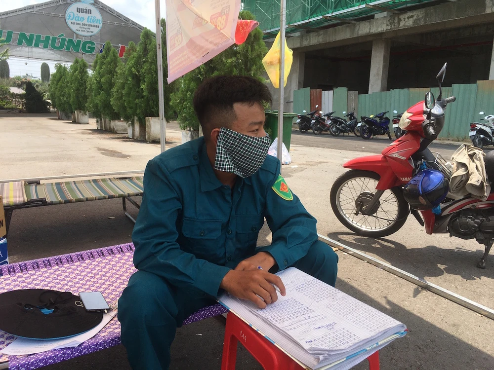 Anh Huỳnh Văn Lành, cán bộ Trạm Y tế phường An Cư (quận Ninh Kiều), dù chân đang bị thương nhưng vẫn xuống đường nhiều giờ liền kiểm tra thân nhiệt các hành khách. Ảnh: HẢI DƯƠNG
