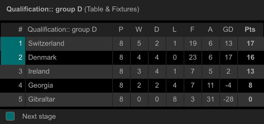 Ở bảng D, bảng đấu được coi là khó đoán nhất cũng đã ngã ngũ ở loạt trận cuối. Hai tấm vé vào chơi Euro cũng đã thuộc về Thụy Sĩ và Đan Mạch. Tuyển Thụy Sĩ giành chiến thắng 6-1 trước Gibraltar để chiếm ngôi đầu bảng D với 17 điểm. Trận “quyết đấu” giữa Ireland và Đan Mạch kết thúc với tỉ số hòa 1-1. Với tỉ số này, Đan Mạch có được vị trí thứ hai bảng D với 16 điểm đồng thời có luôn suất dự Euro năm sau.