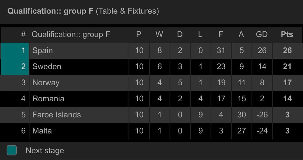Giành chiến thắng 5-0 trước Romania trên sân nhà, Tây Ban Nha kết thúc chiến dịch vòng loại Euro 2020 với 26 điểm, chiếm ngôi đầu bảng F. Thụy Điển giành chiến thắng 3-0 trước Faroe Islands để có được vị trí nhì bảng với 21 điểm. Ở cặp đấu còn lại của bảng F, Na Uy thắng Malta với tỉ số 2-1.