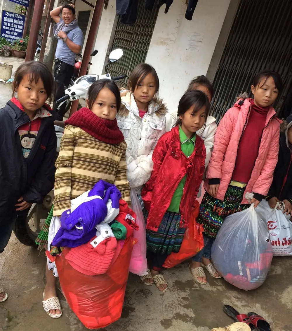 Các em nhỏ được mặc áo ấm trong số 18 bao quần áo nói trên. Ảnh do Facebook TLL gửi