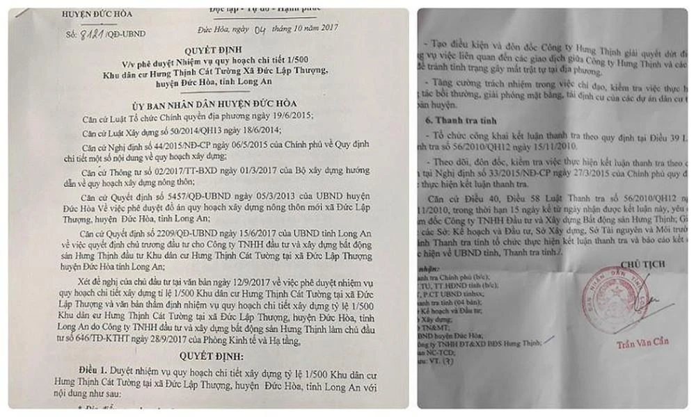 Kết luận Thanh tra số 2696/KL-UBND ngày 4-6-2019 về việc thanh tra toàn diện đối với dự án Khu dân cư Hưng Thịnh Cát Tường tại xã Đức Lập Thượng, huyện Đức Hoà, tỉnh Long An được thực hiện theo Quyết định số 696/QĐ-UBND ngày 27-2-2019 của Chủ tịch UBND tỉnh Long An đối với Khu dân cư Hưng Thịnh Cát Tường. Đây là dự án do Công ty TNHH Đầu tư và Xây dựng BĐS Hưng Thịnh làm chủ đầu tư.