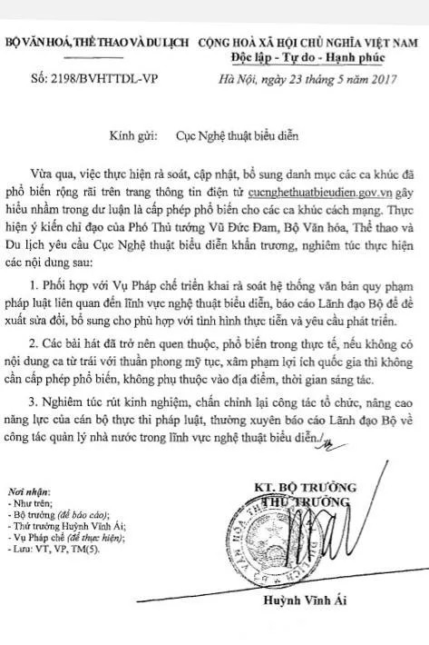 Công văn nêu rõ: Vừa qua, việc thực hiện rà soát, cập nhật, bổ sung danh mục các ca khúc đã phổ biến rộng rãi trên trang thông tin điện tử cucnghethuatbieudien.gov.vn gây hiểu nhầm trong dư luận là cấp phép phổ biến cho các ca khúc cách mạng.