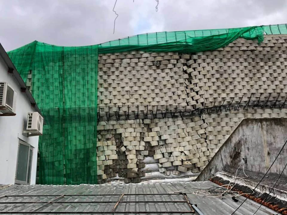 Tường thành xây trái phép đang đổ xuống đầu nhà dân. Ảnh do người dân cung cấp.