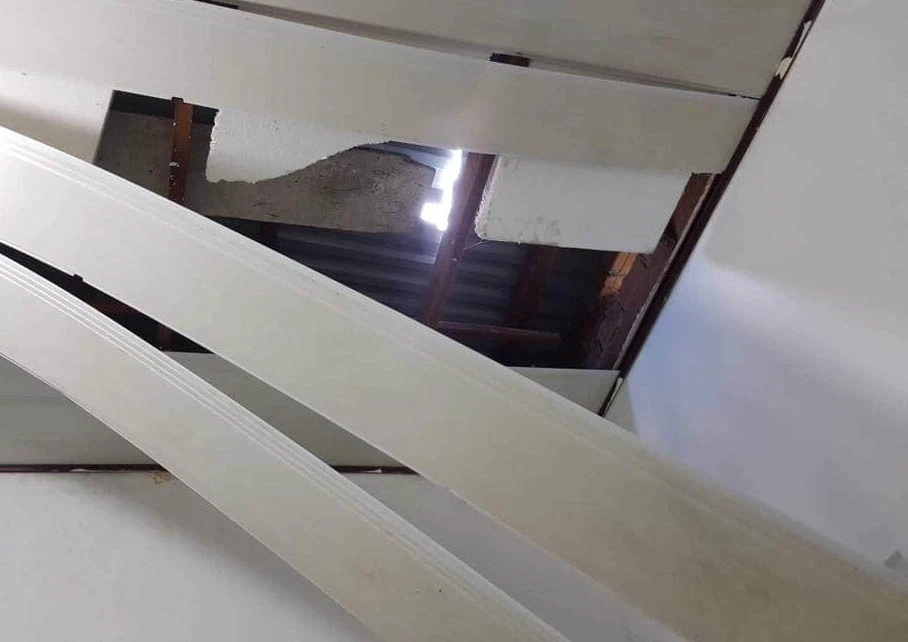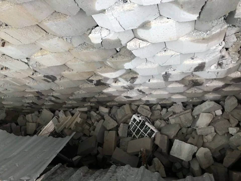 Gạch, bê tông rơi xuống thủng mái nhà dân. Ảnh do người dân cung cấp
