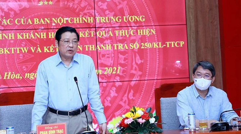 Ngày 8-5, ông Phan Đình Trạc, Ủy viên Bộ Chính trị, Bí thư Trung ương Đảng, Trưởng Ban Nội chính Trung ương, Phó Trưởng ban thường trực Ban Chỉ đạo Trung ương về phòng, chống tham nhũng đã kiểm tra, đôn đốc việc thực hiện kết luận của thường trực Ban Chỉ đạo Trung ương về phòng, chống tham nhũng về xử lý các vụ việc sai phạm tại tỉnh Khánh Hòa.