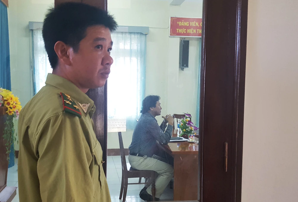 Cán bộ kiểm lâm chặn cửa, không cho báo chí tiếp cận cuộc họp công bố kết luận thanh tra. Ảnh: TẤN LỘC