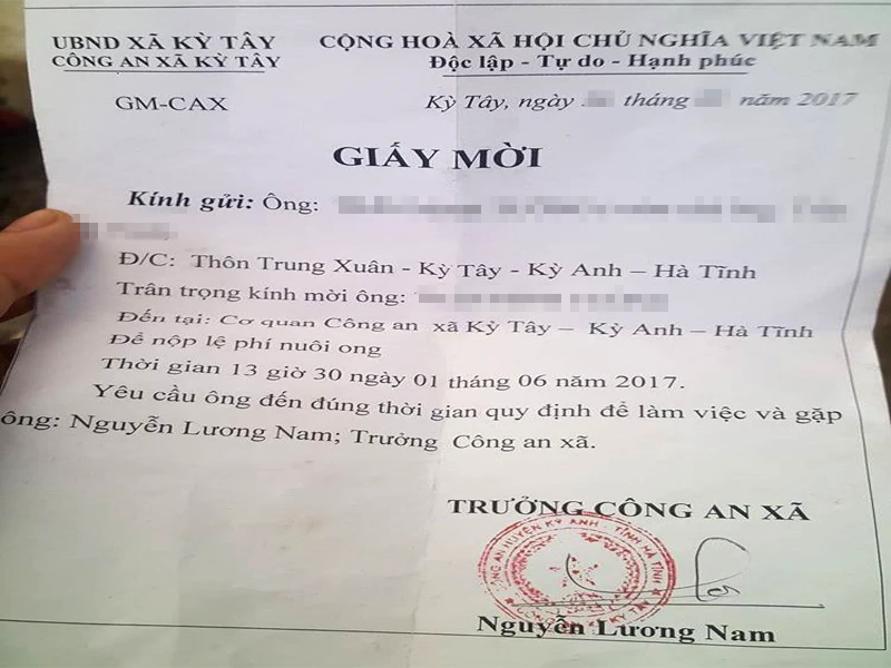 Ngày 9-6, UBND huyện Kỳ Anh (Hà Tĩnh) đang yêu cầu UBND xã và Công an xã Kỳ Tây báo cáo sự việc phát giấy mời đến công an xã nộp lệ phí nuôi ong.