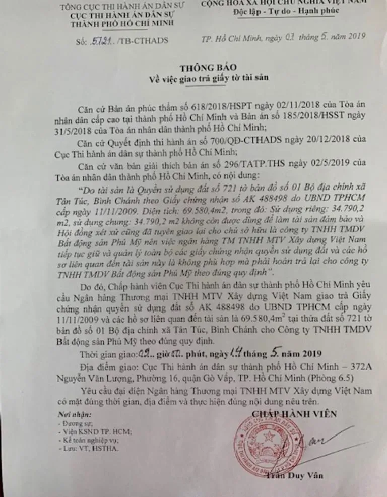 Trước đó, tại buổi làm việc với Cục Thi hành án dân sự TP.HCM vào ngày 13-3-2019, về việc bàn giao tài sản và giấy chứng nhận quyền sử dụng đất cùng các hồ sơ liên quan đến tài sản cho công ty Bất động sản Phú Mỹ, ngân hàng Ngân hàng TM MTV Xây dựng Việt Nam không chấp nhận bàn giao tài sản với các lý do.