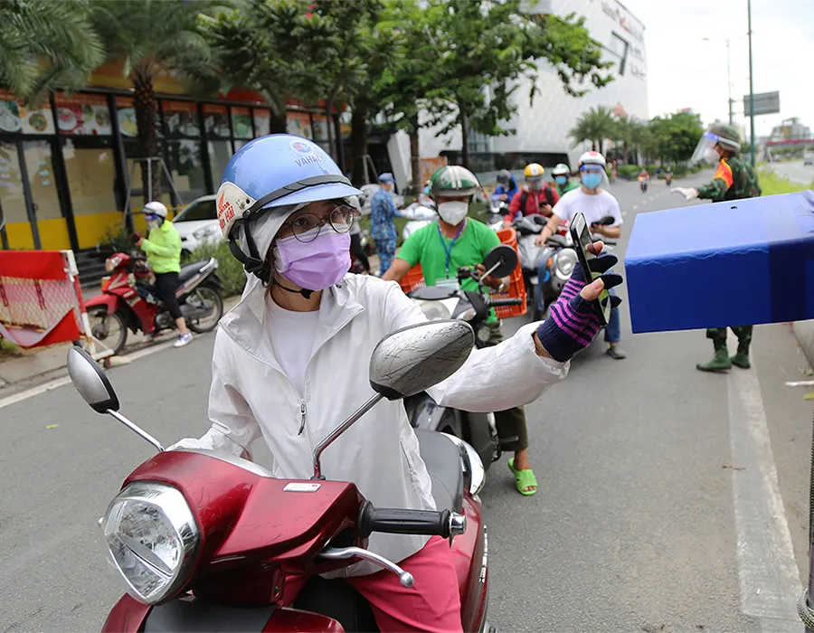 Người dân quét mã QR qua chốt thông qua camera hạn chế tiếp xúc tại chốt trên đường Phạm Văn Đồng, TP Thủ Đức, TP.HCM. Ảnh: HOÀNG GIANG