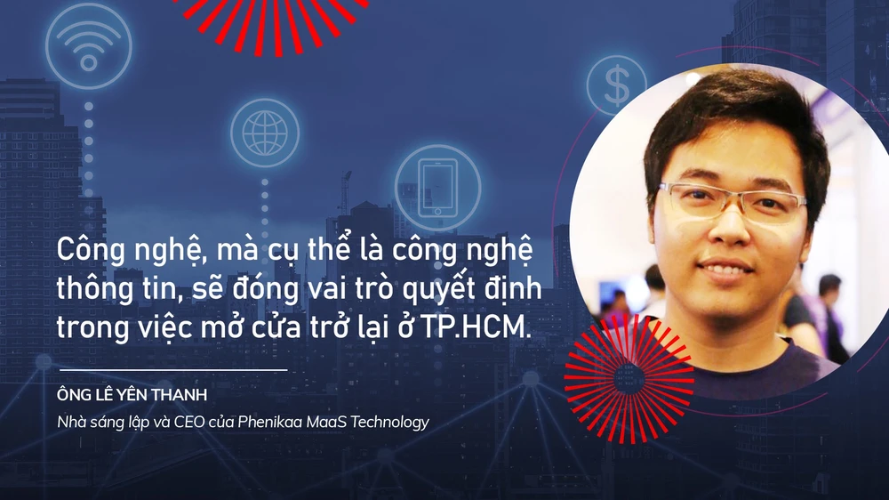 + Ông Lê Yên Thanh: Trong bối cảnh TP dần dần mở cửa trở lại các dịch vụ và ngành sản xuất, sẽ có rất nhiều công việc và thông tin cần được xử lý để giúp cho việc mở cửa trở nên chắc chắn và an toàn. Vì lẽ đó, công nghệ (mà cụ thể là công nghệ thông tin) sẽ đóng vai trò quyết định trong việc mở cửa trở lại ở TP. Nếu chúng ta có thể tự động hóa và triển khai được diện rộng các quy trình bằng công nghệ thông tin, giúp người dân dễ dàng hơn trong việc sống chung với virus thì việc mở cửa trở lại mới trở nên khả thi.