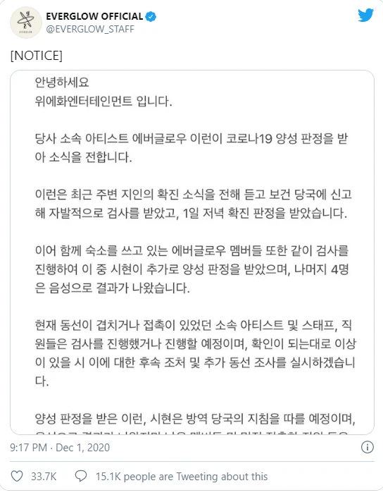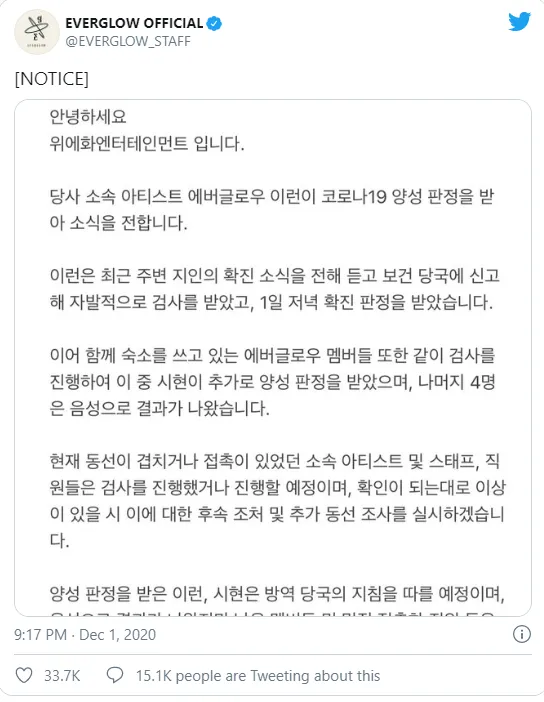 Mặc dù các thành viên còn lại đều cho kết quả âm tính nhưng cả họ và các nhân viên có tiếp xúc với Sihyeon và Yiren sẽ tự cách ly trong hai tuần. Chúng tôi sẽ tích cực hợp tác với chính phủ để tiến hành các biện pháp vệ sinh trong toàn bộ công ty và giảm thiểu nguy cơ lây truyền và lây nhiễm thêm.