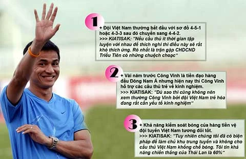 Lần này thì Kiatisak không còn trả lời với tư cách là cầu thủ hoặc là “người ngoài” mà là HLV trưởng đội tuyển Thái Lan - đội bóng năm ngoái vô địch AFF Cup và thành phần nòng cốt đó tiếp tục đá Asian Games đứng thứ tư châu Á. “Sắc” vẫn khuôn mặt láu lỉnh, vẫn nụ cười thường trực và cách trả lời nhỏ nhẹ nhưng lại không dùng điệp khúc “Fifty - fifty” quen thuộc nữa. “Sắc” bắt đầu phân tích nhiều hơn kèm theo cả lời dọa dẫm như muốn hạ gục nhanh thầy trò HLV Miura.